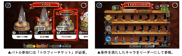 「トロフィーバトル」は、出場条件を満たしたキャラをリーダーにして戦い、“トロP”を獲得することが目的のバトル。一定数のポイントがたまると、さまざまな報酬のほか、キャラの能力値が上昇する“D1武具”などが入手できる。