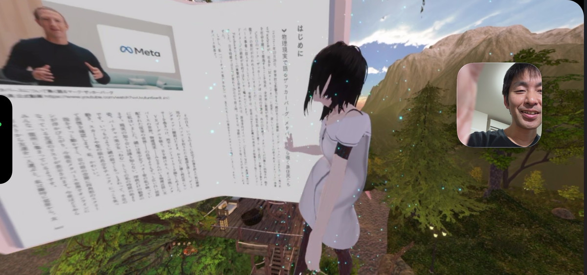 このまま本を開いて読むこともできます。読みづらかったら現実みたいに目をこらすんじゃなくて、こんな風に本を巨大化させてしまったほうが早いですよね。このように、現実世界のように人間ががんばって物理法則に適応してあげる必要はなくて、逆に物理法則を書き換えて世界を人間に適用させることが出来てしまうわけです。これがメタバースです。