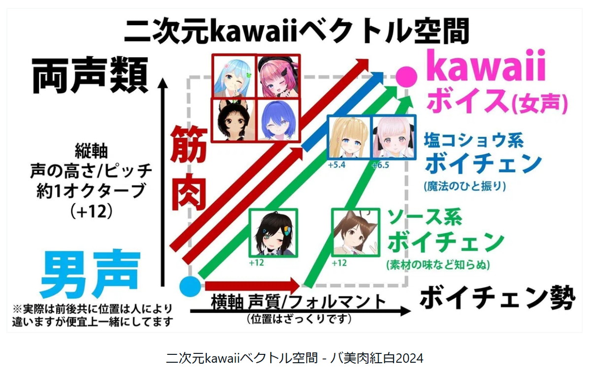 ※バ美肉(バびにく)とは、バーチャル美少女受肉(バーチャルびしょうじょじゅにく)またはバーチャル美少女セルフ受肉(バーチャルびしょうじょセルフじゅにく)の略語。美少女のアバターを纏うこと、あるいは、纏ったうえでサイバースペース(バーチャル空間)の美少女として、VRChat等のサイバースペースで活動したり、バーチャルYouTuber、バーチャルアイドルなどとして活動することを指す。ボイスチェンジャーを使うか自身の発声方法を工夫するなどして発声を美少女に変えるか、または地声のままで、美少女の3Dモデル・イラスト等を使い、バーチャルな美少女になること(Wikiより)