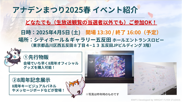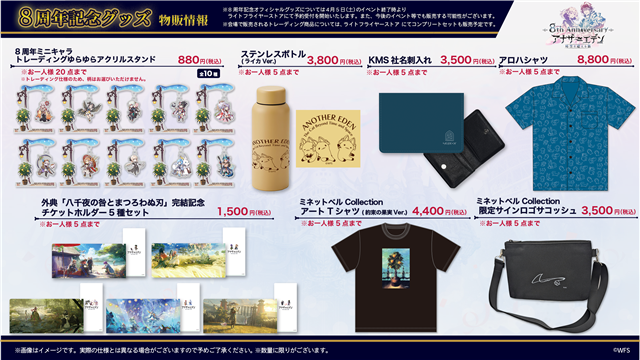 アナザーエデン8周年を記念したオフィシャルグッズ情報を公開した。また、4月5日に開催予定の「アナデンまつり2025春」イベント会場にて、どなたでも参加可能な先行販売を実施する。
