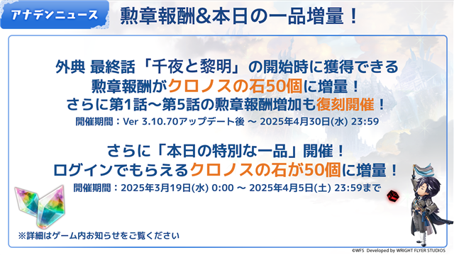 外典「八千夜の咎とまつろわぬ刃」最終話の開始時に獲得できる勲章報酬がクロノスの石50個に増量するキャンペーンを開催。また、第1話〜第5話のキャンペーンを復刻開催。この機会に外典「八千夜の咎とまつろわぬ刃」を最後までプレイしよう!さらに「本日の一品」もクロノスの石50個に増量!合計で最大900個のクロノスの石が手に入る。