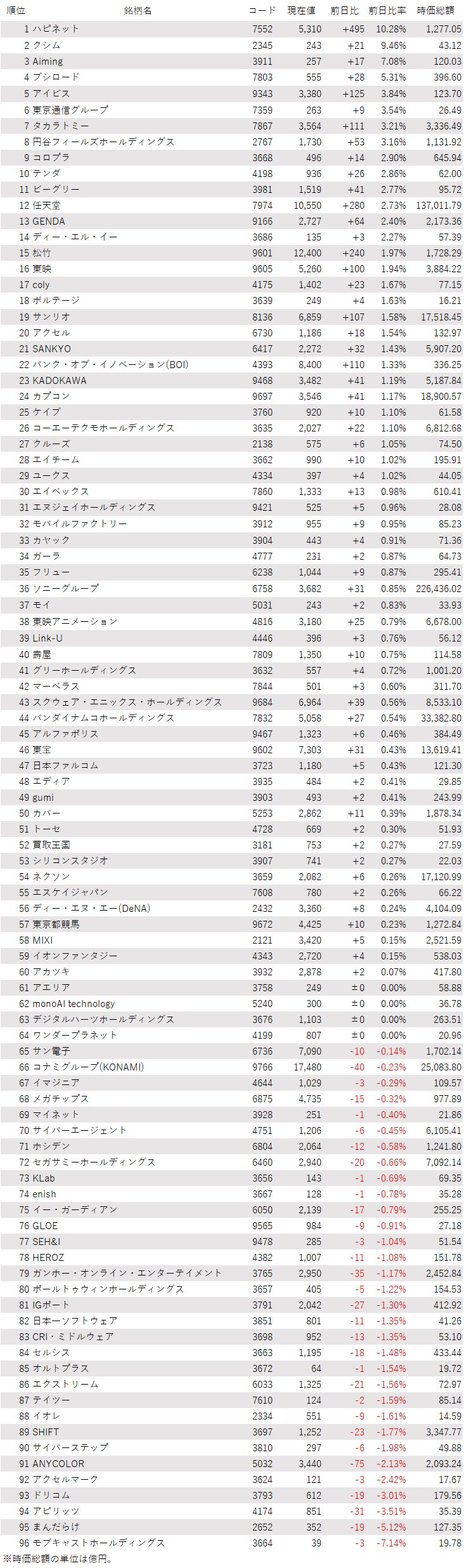 そうした中でゲーム・エンタメ関連株の動きを見てみると、下記の表に登録しているゲーム・エンタメ関連企業96銘柄のうち、上昇は60銘柄(63%)、下落は32銘柄(33%)、変わらずは4銘柄(4%)で、上昇した銘柄が多数を占めた。