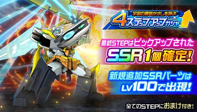 ショートシナリオイベント「宇宙の勇気がオレを呼ぶ」追加にあわせて、新規SSRユニットパーツが封入された「4ステップアップガシャ」を開催中!最終ステップはピックアップされたSSRユニットパーツが1個確定!新規追加SSRパーツはLV100で排出される。本ガシャで入手できるおまけアイテムは「アイテムショップ」内の本おまけアイテムに対応した交換所にて使用可能。さらに新規SSRユニットパーツを入手すると昇格素材を獲得できる期間限定ミッションに挑戦可能!