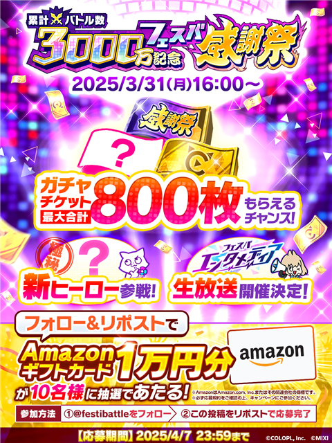 イベント開催を記念して、『フェスバ+』公式X(https://x.com/festibattle)ではAmazonギフトカード1万円分が抽選で10名にあたるリポストキャンペーンを開催している。