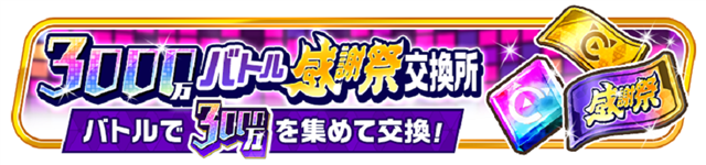 イベント期間中、バトルの報酬やミッション達成報酬から「3000万バッジ」が獲得できる。集めた「3000万バッジ」は期間限定の「3000万バトル感謝祭交換所」にて「3000万バトル感謝祭ガチャチケット」や「スペシャルガチャチケット」などの景品と交換できる。