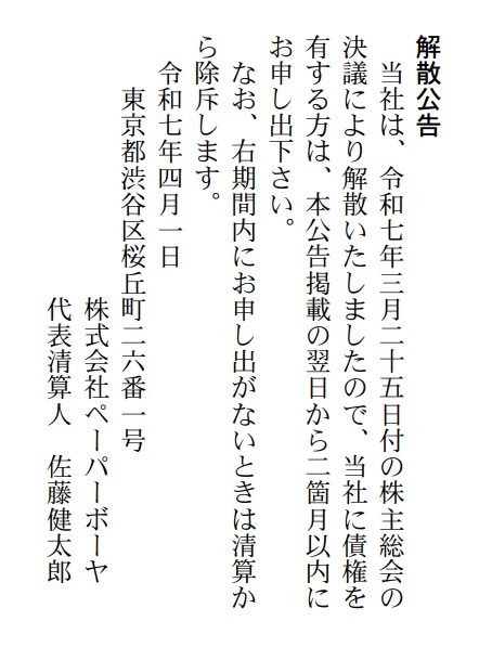 ペーパーボーヤが解散したことがわかった。本日4月1日付の「官報」に掲載された「解散公告」によると、3月25日付けの株主総会で決議したとのこと。コーポレートサイトはなくなっており、GMOペパボにリダイレクトされるように設定されている。