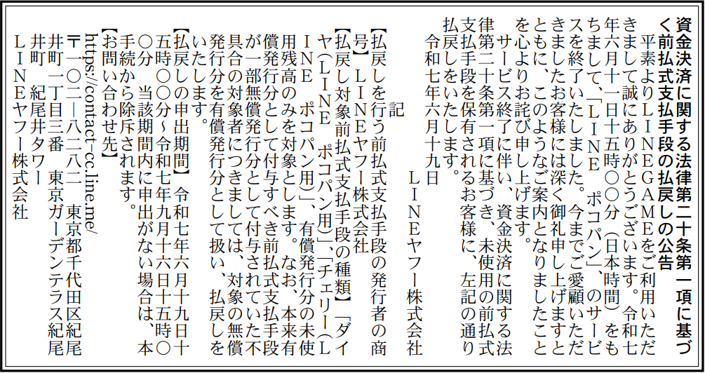 6月19日付の「官報」に資金決済法に基づく前払式支払手段の払戻しの公告が掲載された。