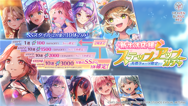 新生活応援 ステップアップガチャは有償クォーツ限定で引くことができ、STEP4、STEP8の10連目はSSスタイルが確定で出現する。