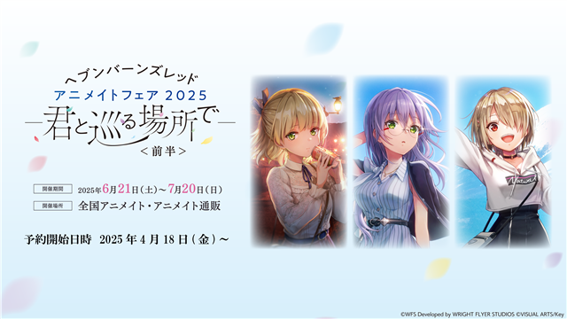 「ヘブンバーンズレッド アニメイトフェア 2025 ―君と巡る場所で―」が6月21日より開催することが決定した!今回のフェアでは、前半・後半の期間が分かれての開催となり、各地の名所をキャラが訪れる描き下ろしイラストを制作している。店頭などで、描き下ろしイラストを使用したオリジナルグッズの販売や、ノベルティの配布などを行う予定。