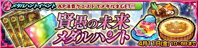 賢愚の未来の配信を記念してメダルハントイベントを開催!「賢愚の未来 メダルハント」の開催期間中、APを消費するクエストをクリアすることでイベント専用の「賢愚の未来メダル」が手に入る。「賢愚の未来メダル」は期間中、専用の交換所にて豪華景品と交換可能。APを消費するクエストであれば、どこでも「賢愚の未来メダル」を獲得することができる。第5部メインストーリー、フリークエスト、イベントクエストなどを遊びながらたくさんメダルを集めよう!下記のイベントクエストでは、「賢愚の未来メダル」の獲得量が増加するボーナスが発生する。1日1回挑戦できるデイリークエストなので、毎日欠かさずにプレイしよう!