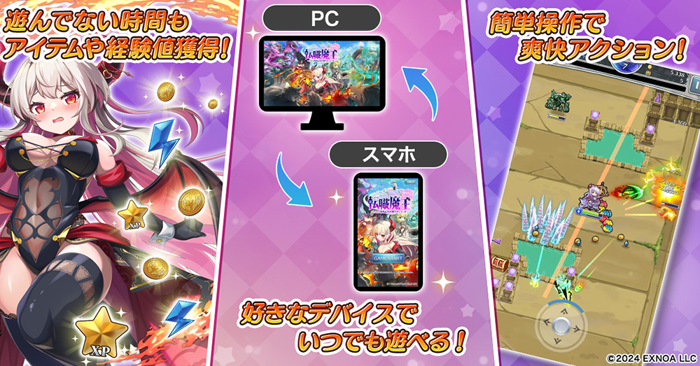 好きな時にPCでもスマホでも遊べ、さらに遊んでいない時間にもアイテムや経験値を手に入れることができる。かわいく可憐な魔族たちと裏切った者達への復讐を果たそう。