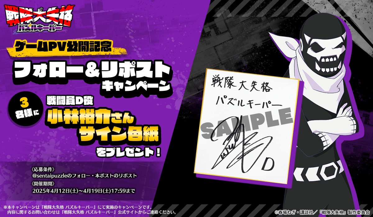 ゲームPV公開を記念して、2025年4月12日より、戦闘員D役・小林裕介さんの直筆サイン色紙が3名に当たるプレゼントキャンペーンを開催する。