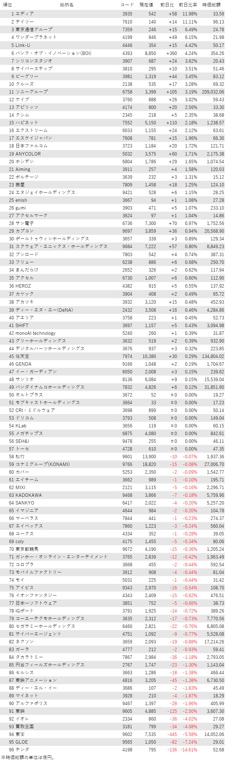 こうしたなか、ゲーム・エンタメ関連企業をみると、登録されている96銘柄のうち、上昇は49銘柄(51%)、下落は39銘柄(41%)、変わらずは8銘柄(8%)で、上昇した銘柄のほうが多かった。