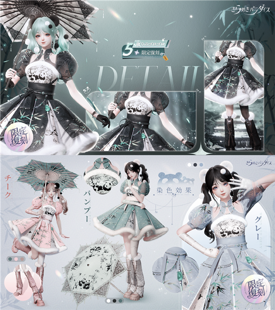 今回復刻する星5セットコーデ二着目は「眠りのゴロゴロ」。パンダの絵柄がアクセントのとってもキュートなワンピース。スカートの上にはパンダが大好きな竹林の模様を入れ、すそと胸元には白いファーを付け、自然の中でいつまでも自由でのびのびと育ってほしいという願いが込められている。足には、今季大注目のトレンドアイテム、ワイドロングレッグカバーを取り入れた!まるで目の前にパンダがいるような、もこもことした可愛さをそのまま感じられる自慢の一着に仕上がっている。パンダと一緒に、大自然の良さを感じてみよう!
