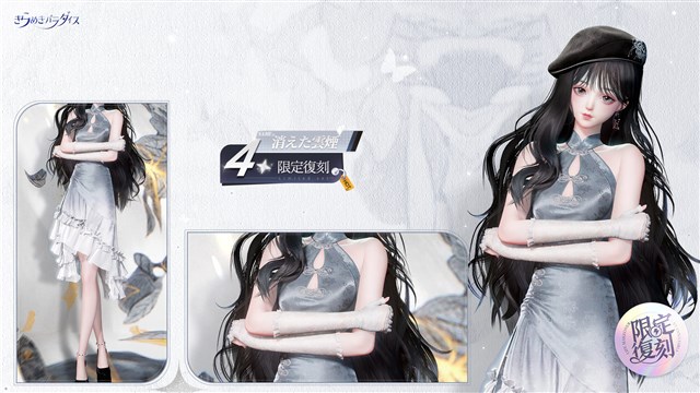 今回復刻する星4セットコーデは「消えた雲煙」。斜めカットのフリルスカートにセクシーな胸空き。現代風アレンジのこのチャイナドレスは、伝統を保ちながらもモダンな雰囲気を纏っている。