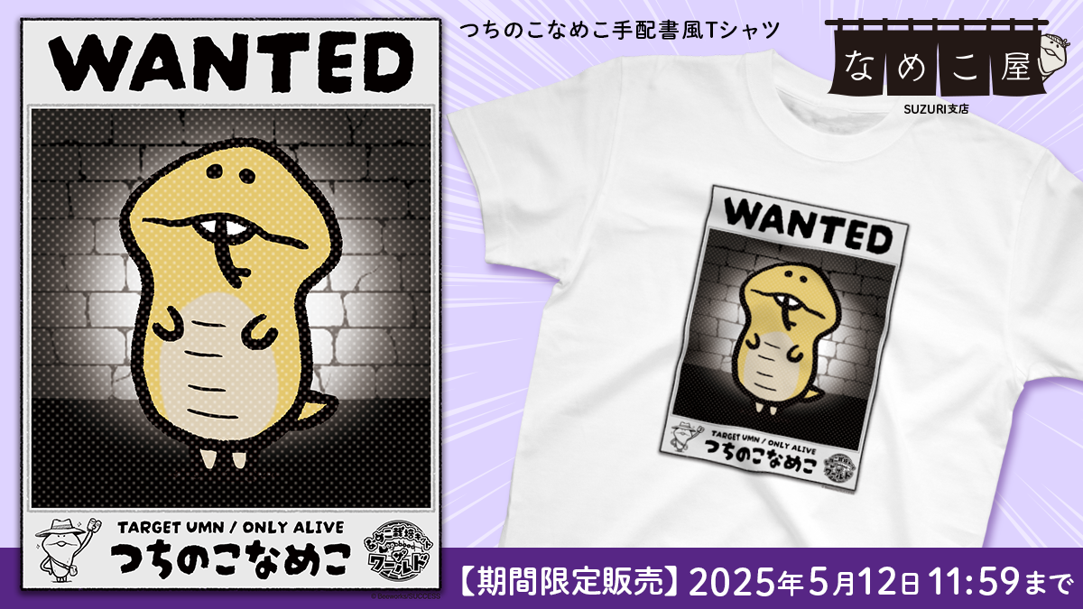 UMNの目撃情報追加を記念して、UMNとして名高い「つちのこなめこ」の手配書風Tシャツを『なめこ屋 SUZURI支店』にて発売中。5月12日までの期間限定となるので、お見逃しなく!