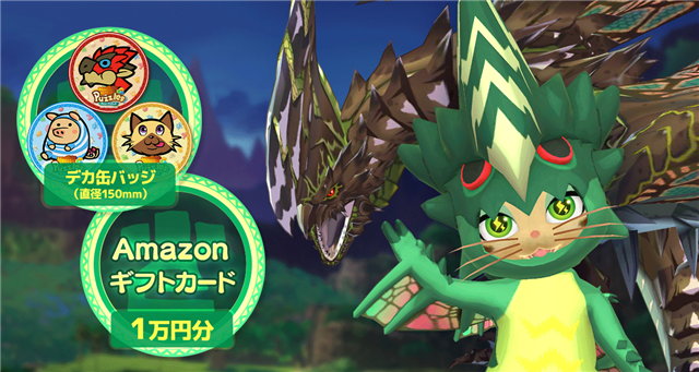 「モンスターハンターパズル アイルーアイランド」公式X (@MHPuzzles)をフォローし、 キャンペーン期間中に指定されたポストをリポストした方から抽選で10名に1万円分のAmazonギフトカード(デジタルギフト)、抽選で30名にスタンド・壁掛けタイプデカ缶バッジをプレゼントする。
