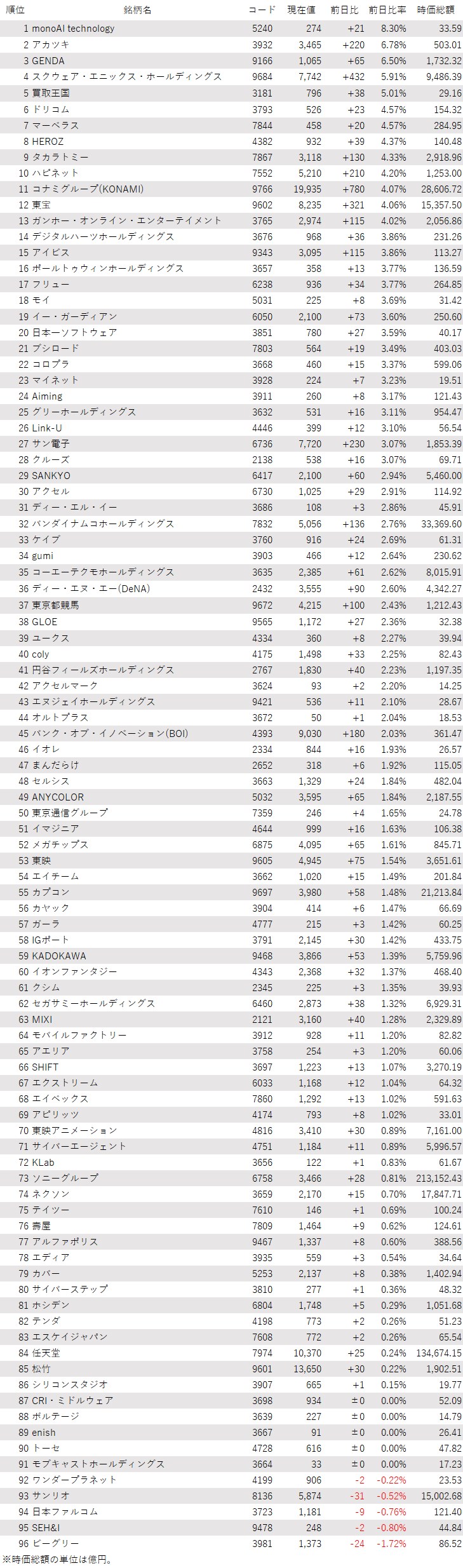 そうした中でゲーム・エンタメ関連株の動きを見てみると、下記の表に登録しているゲーム・エンタメ関連企業96銘柄のうち、上昇は86銘柄(90%)、下落は5銘柄(5%)、変わらずは5銘柄(5%)で、ほぼ全面高の様相を呈した。