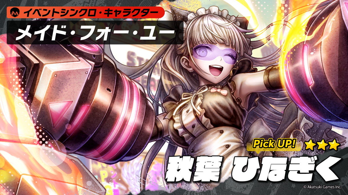 Ver1.1.0アップデート後より、期間限定で開催中のイベントシンクロ・キャラクター「メイド・フォー・ユー」で、★3 キャラクター「秋葉 ひなぎく」が新登場。秋葉 ひなぎく最大の特徴は、プライマリ攻撃を長押しすることで繰り出せる「チャージ攻撃」。このアクションは、チャージ中にエネミーの攻撃を受けると「パリィカウンター」が発動するという攻守一体の性能を有している。ブレイク性能も高く、可愛さと戦いやすさを兼ね備えたキャラクター。