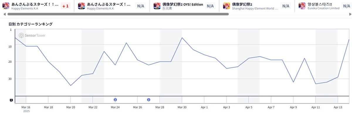 | 29 | 15 | ↓14 | あんさんぶるスターズ!!Music | Happy Elements |