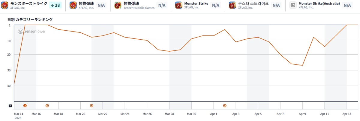 4月14日9時30分現在のApp Storeセールスランキング(ゲームカテゴリー)は、MIXI<2121>の『モンスターストライク』(以下『モンスト』)が首位に立った。