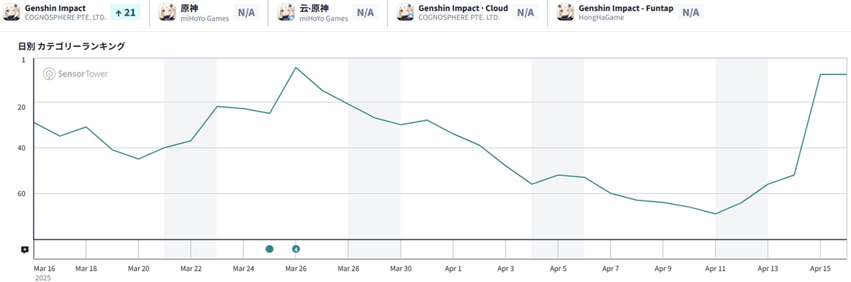 そうした中、HoYoverseの『原神(げんしん)』が52位から8位に浮上している。『原神』は4月15日より、限定★5 キャラクター「シロネン(岩)」、「ウェンティ(風)」などが登場するイベント祈願を開催しており、売上に貢献したようだ。