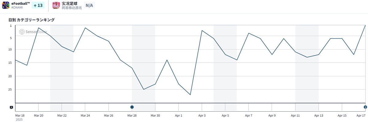 4月18日9時30分現在のApp Storeセールスランキング(ゲームカテゴリー)は、コナミデジタルエンタテインメントの『eFootball』が11ランクアップでトップに立った。