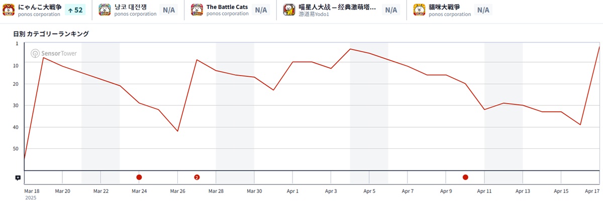 | 30 | 20 | ↓10 | にゃんこ大戦争 | ポノス |