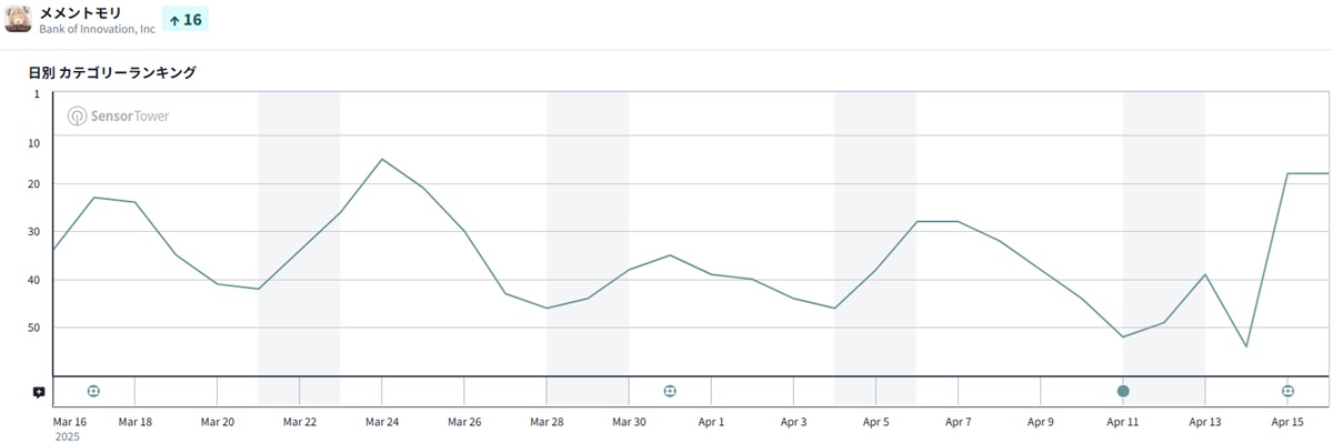 バンク・オブ・イノベーションの『メメントモリ』が36ランクアップでトップ30に復帰した。