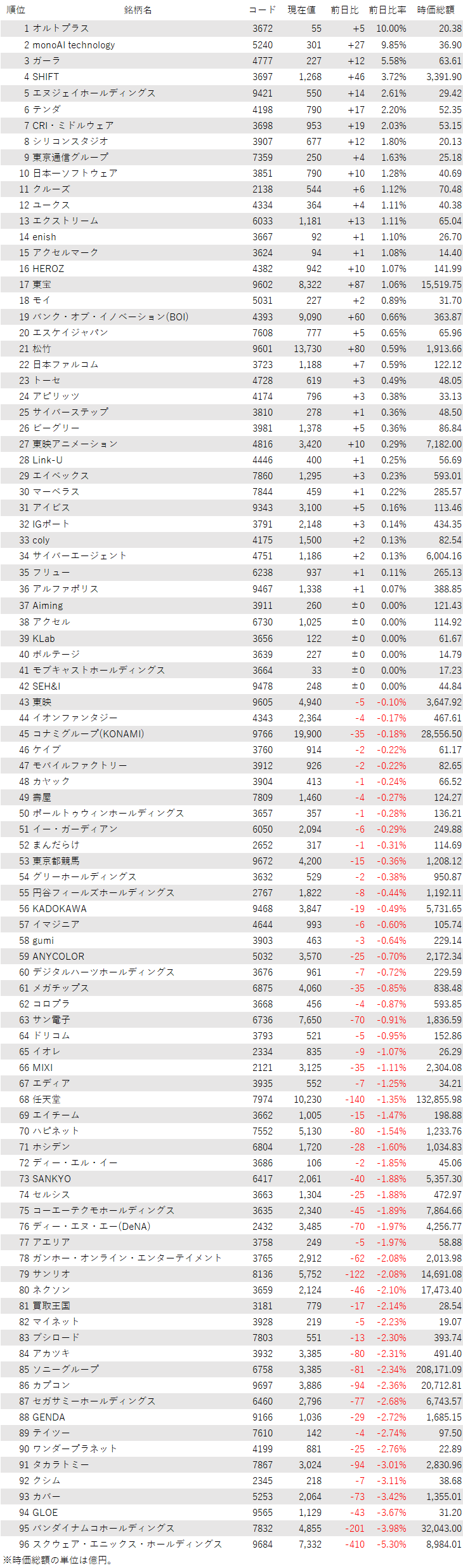 個別銘柄では、オルトプラス<3672>やmonoAI technology<5240>、ガーラ<4777>、SHIFT<3697>が買われた一方、スクウェア・エニックス・ホールディングス<9684>、バンダイナムコホールディングス<7832>、GLOE<9565>、カバー<5253>が売られた。