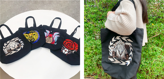 モンスターのアイコンをダイナミックにあしらった「刺繍トートバッグ」。「アルシュベルド」と「ラバラ・バリナ」、「ウズ・トゥナ」、「レ・ダウ」の4種で用意した。プリントでは表現できない、刺繍ならではの緻密で美しい立体感と高級感のある仕上がりになっているので、ぜひお手に取ってみてください。