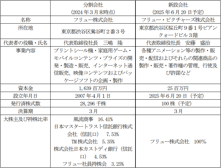 フリュー<6238>は、この日(4月21日)、会社法の新設分割の手法で同社のアニメ事業を切り出し、新しい子会社として「フリュー・ピクチャーズ株式会社」を設立することを明らかにした。効力発生日は6月20日を予定している。安藤 盛治氏が社長に就任する。