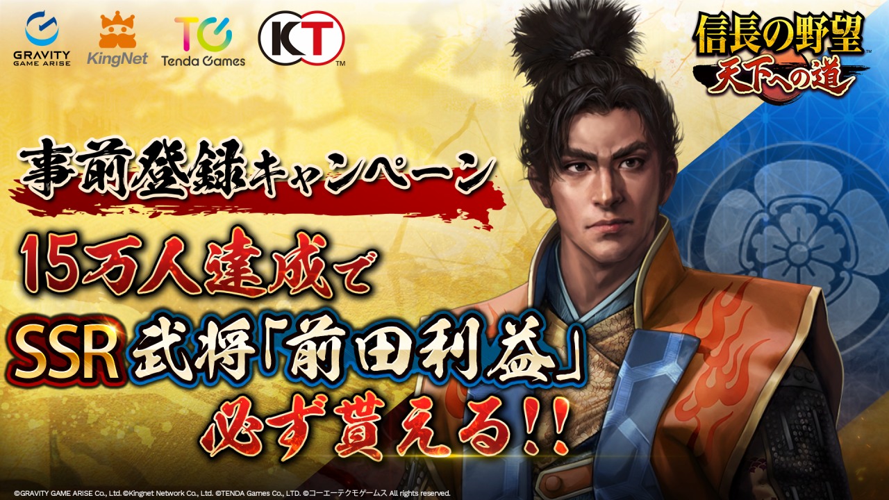 キャンペーン特典は、事前登録者数が増えれば増えるほどグレードアップしていく。事前登録者数に応じて、ゲーム内通貨である「金(無償)」や武将募集ができる「初陣記念募集券」が獲得できるほか、15万人達成時にはSSR武将である「前田利益」をお客様全員にプレゼントする。