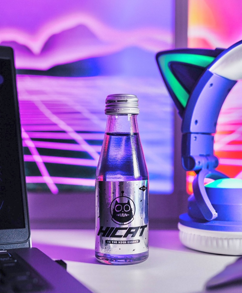 HICATは、2023年5月16日に販売を開始した、マタタビ配合のエナジードリンクです。(プレ販売は2022年12月より)瓶のボトルに紫色のドリンク、銀のラベルが特徴で、メタバース空間やデジタル感を意識した個性的なデザインになっています。フルーティーで飲みやすい微炭酸フレーバーで、カフェインを配合していないため、夜でも飲むことができます。蓋を開けた瞬間にひろがるハーブの香りにもこだわりました。