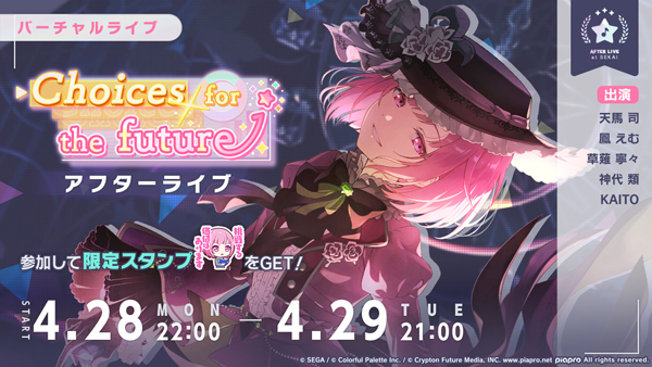イベント終了後には「バーチャルライブ」でのアフターライブとして、「Choices for the future アフターライブ」を開催する。