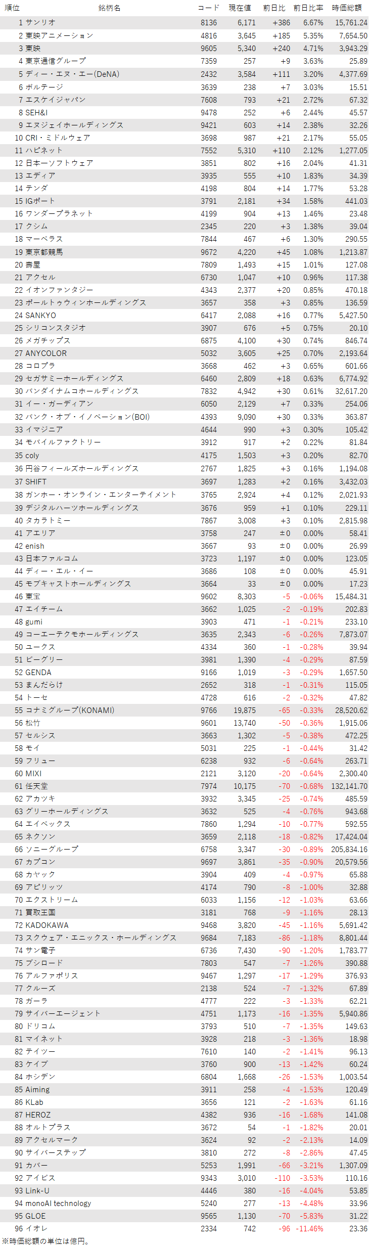 こうしたなか、ゲーム・エンタメ関連企業をみると、登録されている96銘柄のうち、上昇は40銘柄(42%)、下落は51銘柄(53%)、変わらずは5銘柄(5%)で、下落した銘柄の方が多かった。