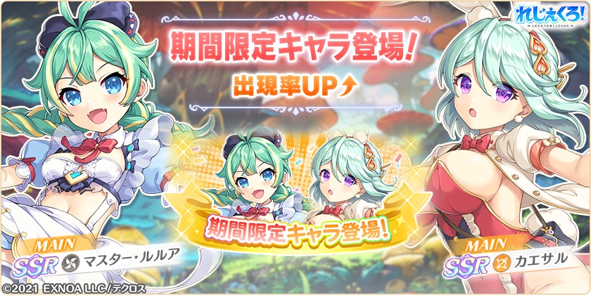 EXNOAは『れじぇくろ!~レジェンド・クローバー~』にて、れじぇくろ!3.5周年!100連目はSSR1体確定!最大100連引ける1日1回10連無料ガチャを開催している。そして、新たにメルヘン衣装に着替えた「マスター・ルルア」「カエサル」「ガラハッド」が登場!