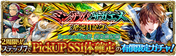 「2周限り!ステップ7でPickUPSS1体確定の有償限定ガチャ!ミンサガ&サガエメ発売日記念 Romancing祭 御堂綱紀編」