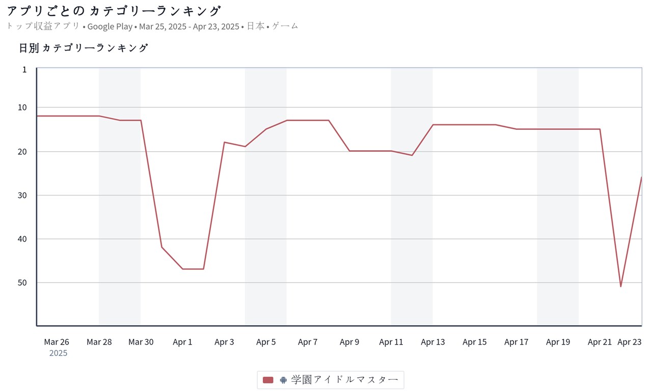 また、バンダイナムコエンターテインメントの『学園アイドルマスター』が前日の51位から26位に急上昇し、トップ30圏内に復帰した。『学マス』は、4月22日11時より、新プロデュースアイドル「【Our Chant】十王星南」が登場した「Our Chantガシャ」を開催していることが今回の順位上昇の原動力となっているもようだ。
