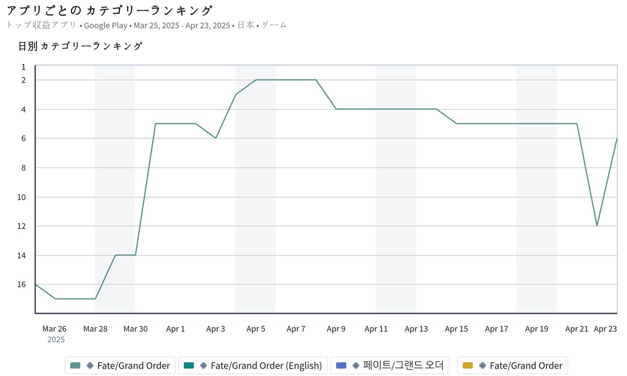 トップ10圏内では、FGO PROJECTの『Fate/Grand Order』が前日の12位から6位に浮上してきた。『FGO』は、4月21日18時より、「【週替り】バーサーカーピックアップ2召喚」を開催しており、強力な期間限定サーヴァントである「★5(SSR)モルガン」や「★5(SSR)アルジュナ〔オルタ〕」などがピックアップ対象として登場していることが売上に寄与しているようだ。