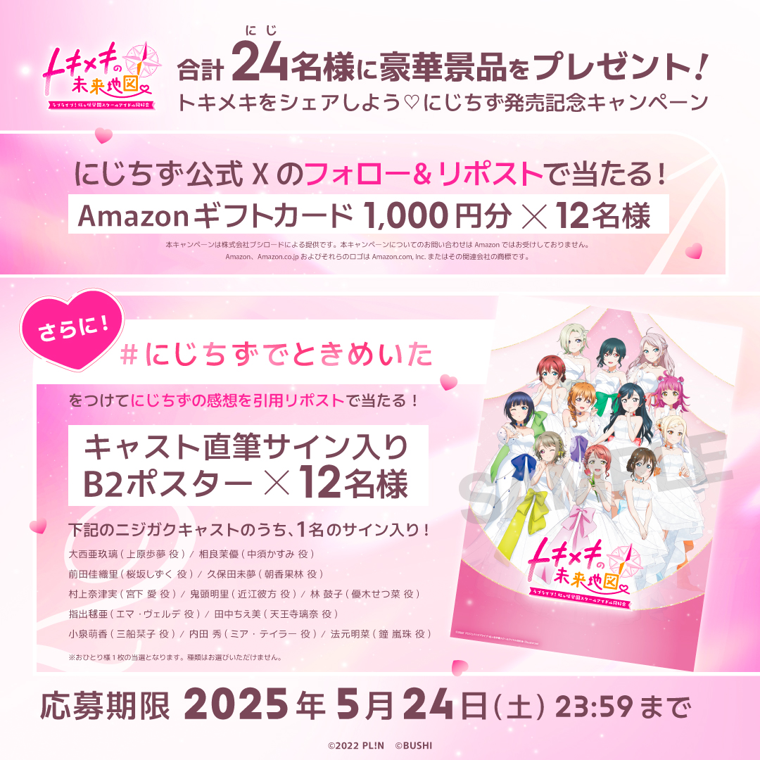 にじちず公式X(@Nijigaku_TMC)のフォロー&対象ポストのリポストだけでAmazonギフトカード1000円分が抽選で12名に当たる。さらに、「#にじちずでときめいた」をつけてにじちずの感想を引用リポストすると、ニジガクキャストのサイン入りB2ポスターが当たるチャンス。