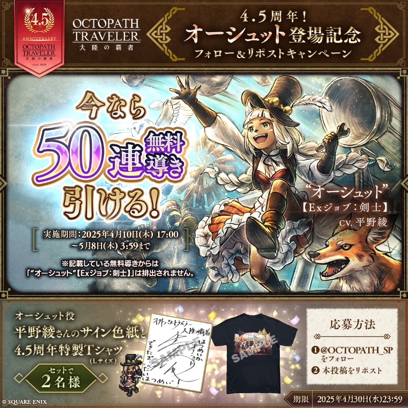 期間中、公式 X をフォローの上、該当のポストをリポストした中から、オーシュット役の平野綾さんのサイン色紙と 4.5 周年特製 T シャツのセットを抽選で 2 名にプレゼント。