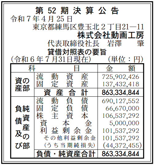 アニメーション制作スタジオの動画工房の2024年7月期(第52期)の決算は、最終損失が4400万円だった。4月25日付の「官報」に掲載された「決算公告」でわかった。