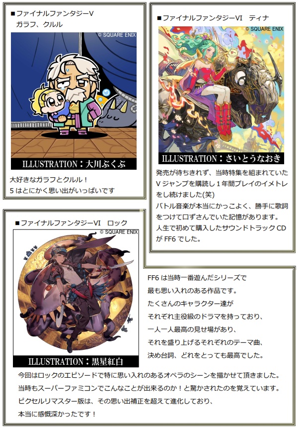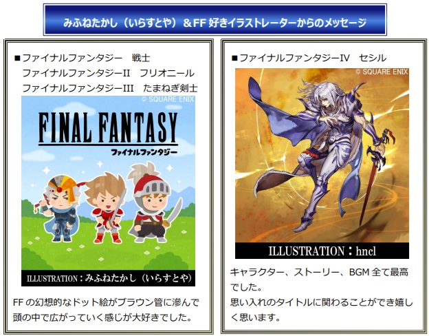 また、本イベントの開始を記念して、描き下ろしドット絵、並びに、みふねたかし(いらすとや)・FF 好きイラストレーター描き下ろしイラストを公開した。本イラストは、館内での展示やポップアップストアでのグッズ販売を予定している。