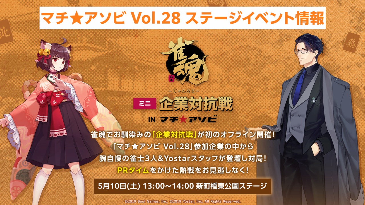 Yostarは、対戦型麻雀ゲーム『雀魂-じゃんたま-』において、5月10日~5月11日に徳島市で開催されるイベント「マチ★アソビvol.28」に出展する。