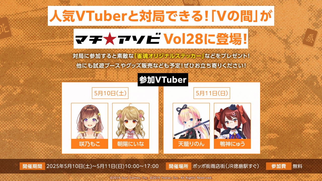 徳島から広がる進化型アニメイベント「マチ★アソビ」に『雀魂-じゃんたま-』が出展する。当日は人気VTuberと対戦できる大好評企画「Vの間」を始めとした対局スペースの用意や、ステージイベントとして「マチ★アソビvol.28」参加企業をお招きしての「ミニ企業対抗戦」なども実施予定となる。ぜひ会場へご来場の際はお立ち寄りほしい。