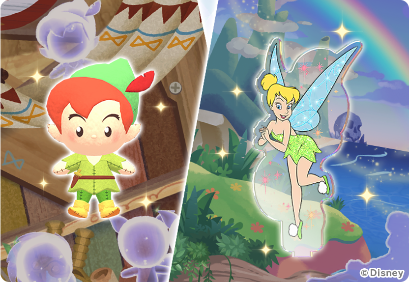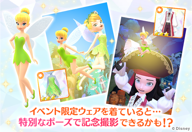 イベント報酬として入手できる「スライトリーのカジュアルウェア」や、同時開催中のガチャから登場する「ティンカー・ベルの妖精ドレス」「フック船長のパイレーツウェア」を着用していると、ティンカー・ベルと特別なポーズで記念撮影ができる。