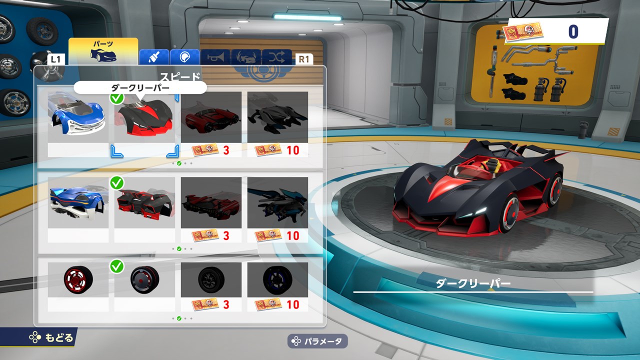 レースで使用するマシンを自由にカスタマイズすることができる。フロントパーツ/リアパーツ/タイヤのパーツ変更に加え、カラー変更やステッカーを貼ることもできる。 ゲームをたくさんプレイしてチケットを集めることで、マシンパーツやガジェットが購入できる。