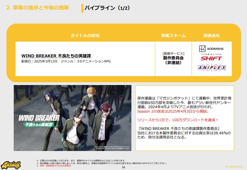 Aimingの決算説明資料より…新作『ウィンヒロ』を3月12日にリリース 開発中タイトルは「新作アニメ系 プロジェクトG」と「ゲーム系IP プロジェクトLG」の2本に