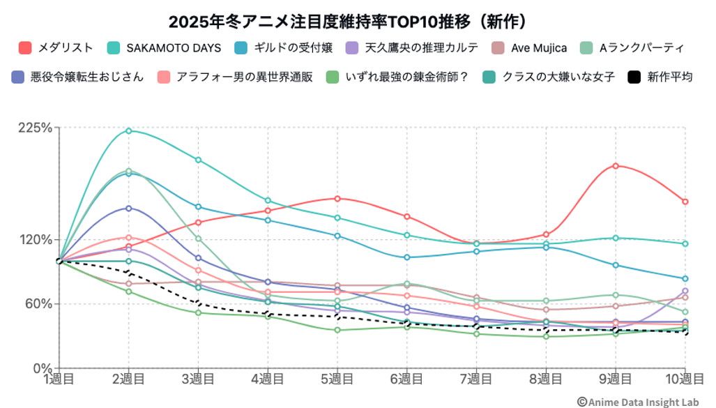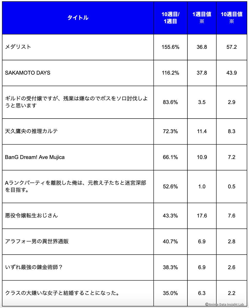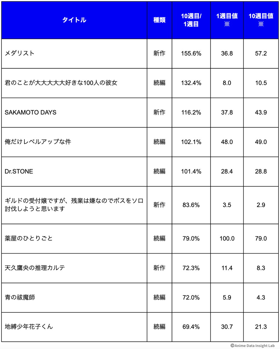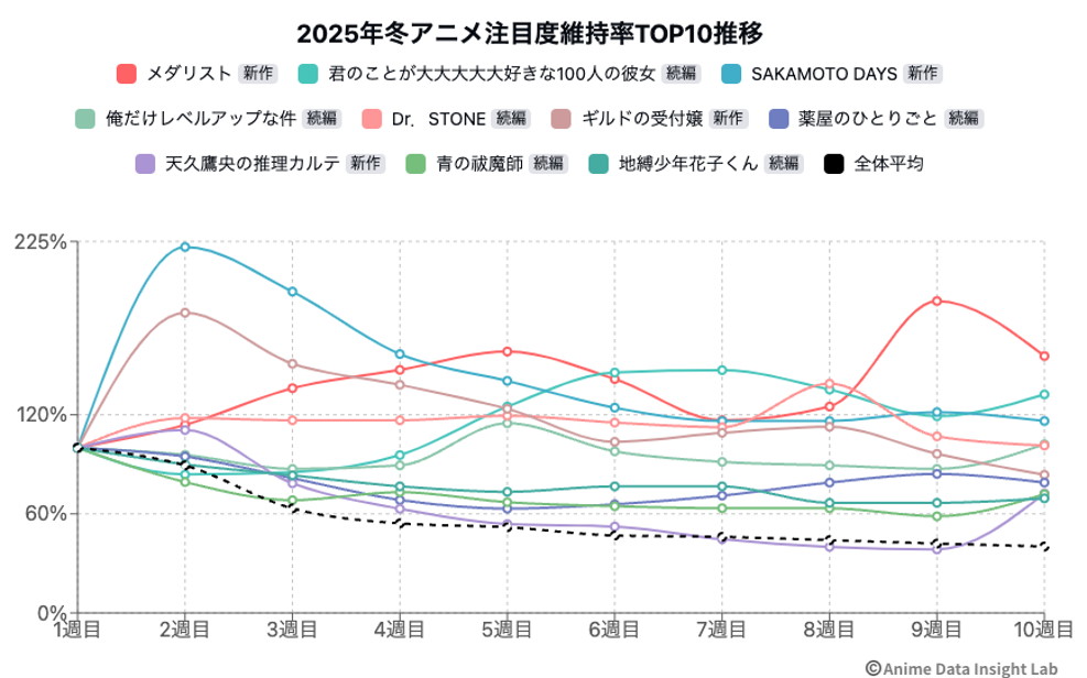 トップ5作品のうち、3作品(『メダリスト』『100カノ』『SAKAMOTO DAYS』)が10週目時点で1週目を上回る注目度を維持している。これは稀なケースであり、これらの作品が視聴者から特に高い評価を得ていることを示している。